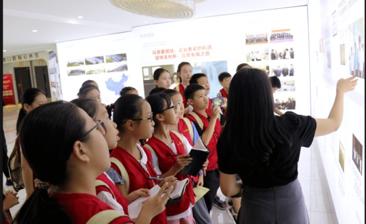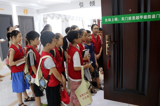 小朋友穿著印有永康日報小記者的紅色馬甲,背著一個米黃色的小書包,排著整齊的隊伍,來到樣品展廳,工作人員介紹了王力的發展歷程、企業文化和智能家居產品等內容,演示了王力智能門鎖和智能小管家。