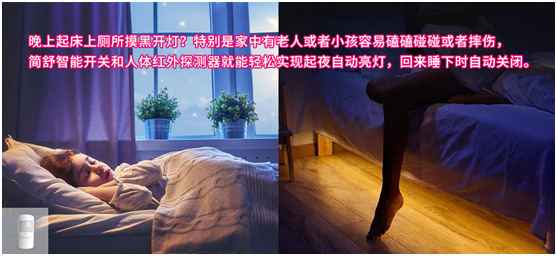 家中老人或小孩子每天晚上起床上廁所,摸黑開燈,特別容易磕磕碰碰或者摔傷,但是你使用簡舒智能開關和人體紅外探測器就能夠輕松實現(xiàn)起夜燈光自動亮起,當你下床準備上廁所時,人體紅外探測器會探測到有人活動,房間的燈帶和洗手間的燈光會立即自動亮起,當上完廁所回來睡下時,燈光又會自動關閉,是不是覺得這樣的生活特別舒心、方便?