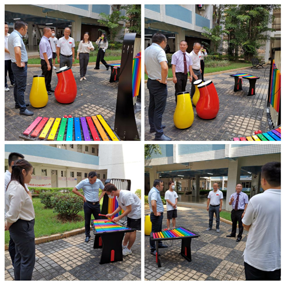 儀式結束后,學院領導與廖展波先生一同前往參觀笛馳戶外音樂廳,廖展波先生分別對每個樂器進行詳細的介紹與操作講解,更有校園領導親身體驗笛馳戶外敲擊樂的敲打樂趣,感受敲打發(fā)出的美妙音樂。