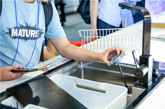此次展會上,我們帶來的新款智能水槽洗碗機,也是黑科技滿滿,聚焦清洗細分。首先,它能智能識別碗盤的污濁等級,針對中式餐具臟污程度不一的特點,設置了6大洗滌模式,應對不同場景。其次,“分離式水流”凈水系統(tǒng),將自來水經(jīng)凈化處理分為超濾凈水、軟水,以及普通自來水,實現(xiàn)不同需求分質(zhì)供水。軟水洗碗不留水漬,使餐具、瓷器光潔如新,并且軟水可以使油污分解效果更佳,從而減少使用洗滌劑,大大利于環(huán)保。