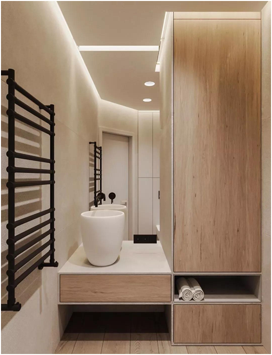 衛(wèi)浴間,主調為“明亮柔和”。這個地方狹小,暗角比較多,以防水筒燈照亮大片面積,設有鏡前燈,在沐浴區(qū)也補充一下局部照明。