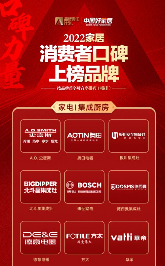 今日,《中國好家居——2022中國家居消費者口碑調(diào)查》結(jié)果公布,2022家居消費者口碑榜家電|廚房品類榜單揭曉。其中,華帝榮膺“2022消費者口碑品牌”稱號。