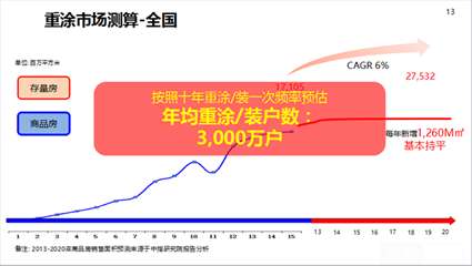 立邦今年正式推出制造商轉(zhuǎn)型成為完整解決方案的服務(wù)商,通過四年來的總結(jié),以前生產(chǎn)涂料、賣涂料,現(xiàn)在有很多內(nèi)容要做,是整體的服務(wù),是我們從免費(fèi)的質(zhì)檢到制訂方案、再到怎么解決的過程。這個(gè)是量,我們國家按照13億人口來說,大概有3億戶的家庭,如果按十年重裝一次的話,每年有3千萬戶的需求。如果我們把5%的高端人群列出來,那么每年大概有250萬戶重涂,按每單一萬來算,重涂的金額是250億,這是高端人群,中低端的人群還沒有算,如果算進(jìn)去這個(gè)量要大很多。