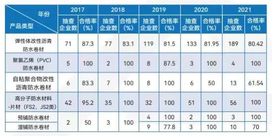 2017-2021年建筑防水卷材產(chǎn)品抽查統(tǒng)計(jì)表