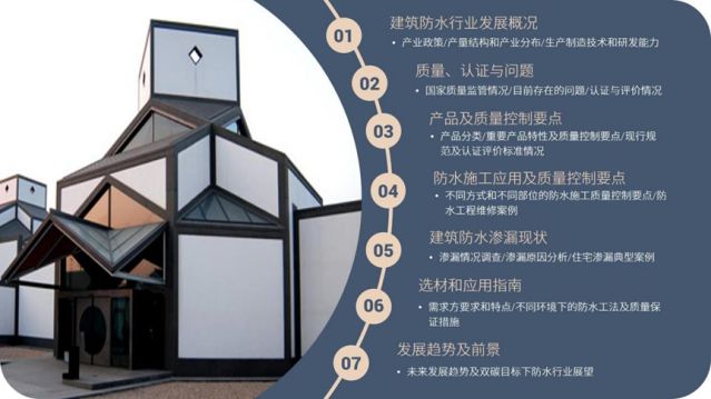 白皮書從近幾年的宏觀政策解讀入手,全面分析防水行業(yè)發(fā)展概況,介紹各類防水材料的特性、質(zhì)量、標(biāo)準(zhǔn)、認(rèn)證和監(jiān)管等情況。