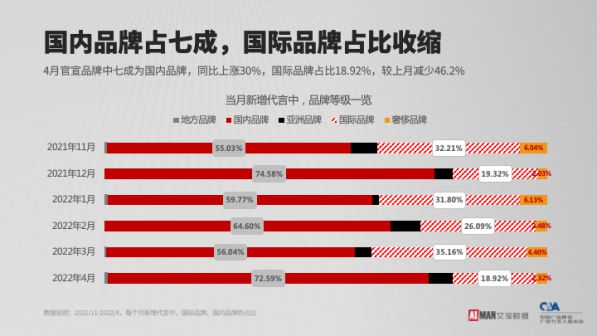 與去年相比,今年4月的新增代言品牌中,占比最多的國內品牌占比繼續提升,達到72.59%,同時也擠壓了國際品牌、奢侈品牌的市場,這兩大類品牌代言占比收縮。