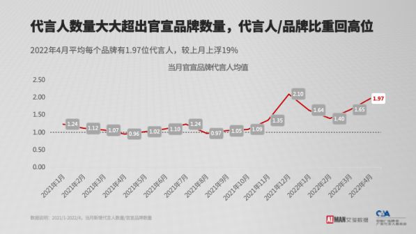 因此,一品牌邀請“多星”代言的現象在4月更為明顯,代言人/品牌比例達到1.97,平均每個品牌幾乎要邀請2位代言人。
