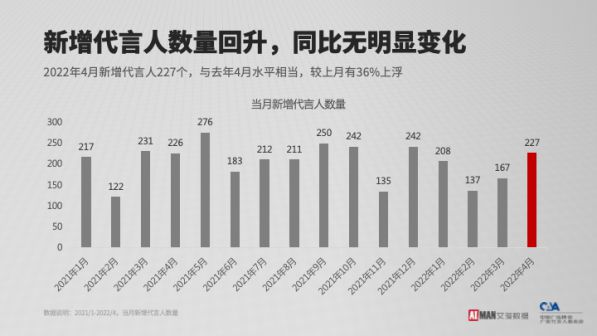 與品牌官宣的小幅提升相比,2022年4月新官宣代言人數量增幅則更加明顯,共計227位新增代言人,與去年同期水平相當。不過,去年的226位代言人是由236個品牌產生的,而今年的品牌數卻只有去年的一半。