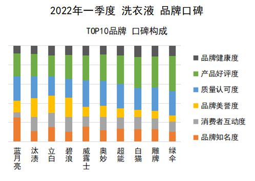品牌健康度方面,立白、汰漬、碧浪位居前三。藍月亮、威露士、超能、白貓、奧妙、雕牌、綠傘分列第四至第十位。
