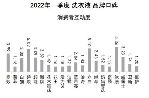 消費者互動度方面,汰漬、立白、碧浪位居前三。奧妙、威露士、超能、白貓、雕牌、綠傘、藍月亮分列第四至第十位。