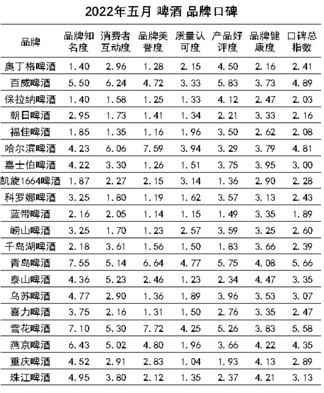 2022年6月15日,中國品牌口碑指數:2022年五月啤酒品牌口碑報告(以下簡稱《報告》)在京發布。