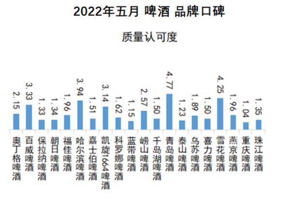 質量認可度方面,青島啤酒、雪花啤酒、哈爾濱啤酒位居前三。百威啤酒、凱旋1664啤酒、嶗山啤酒、奧丁格啤酒、福佳啤酒、燕京啤酒、烏蘇啤酒分列第四至第十位。
