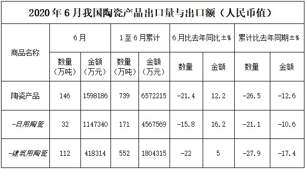 海關(guān)數(shù)據(jù)顯示:6月,陶瓷產(chǎn)品出口量146萬噸,同比減少21.4%,降幅比上月收窄19.7個百分點;出口額1598186萬元,同比增長12.2%。其中,建筑用陶瓷出口量112萬噸,同比減少22%,降幅比上月收窄22個百分點;出口額418314萬元,同比增長5%。